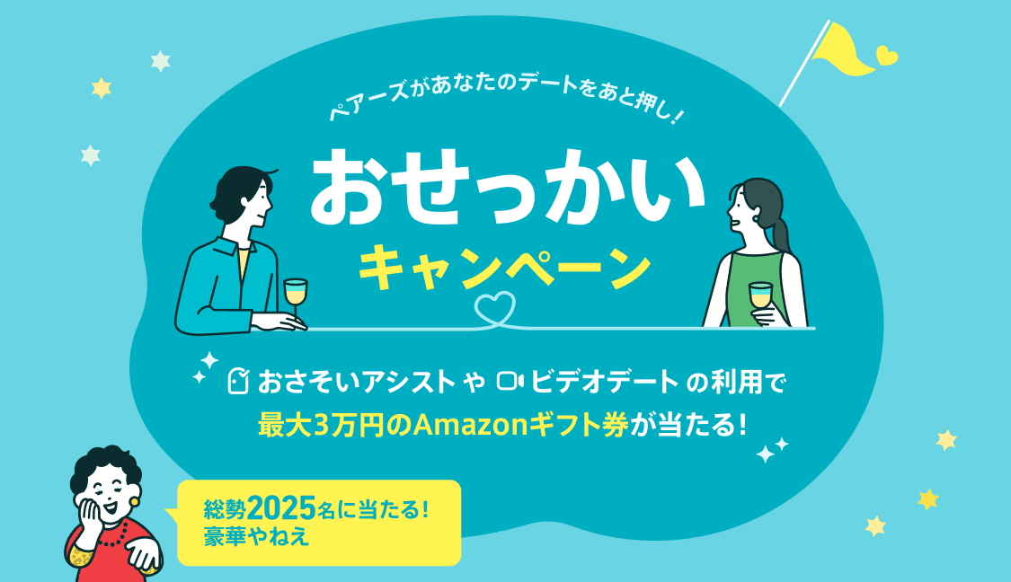 ペアーズが2024/12/13~2025/1/7まで、期間限定でおせっかいキャンペーンを開催!あなたのデートをあと押しします。