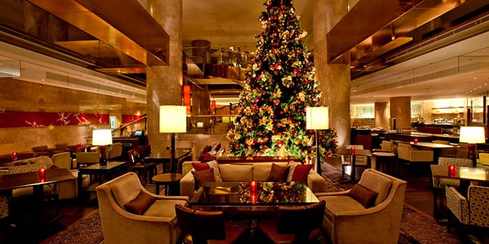 ロビーフロアに位置する吹き抜けの開放感あふれる「マーブルラウンジ」。ラウンジには高さ6mものクリスマスツリーが登場しました。一歩足を踏み入れると、クリスマスムードを味わうことができます。