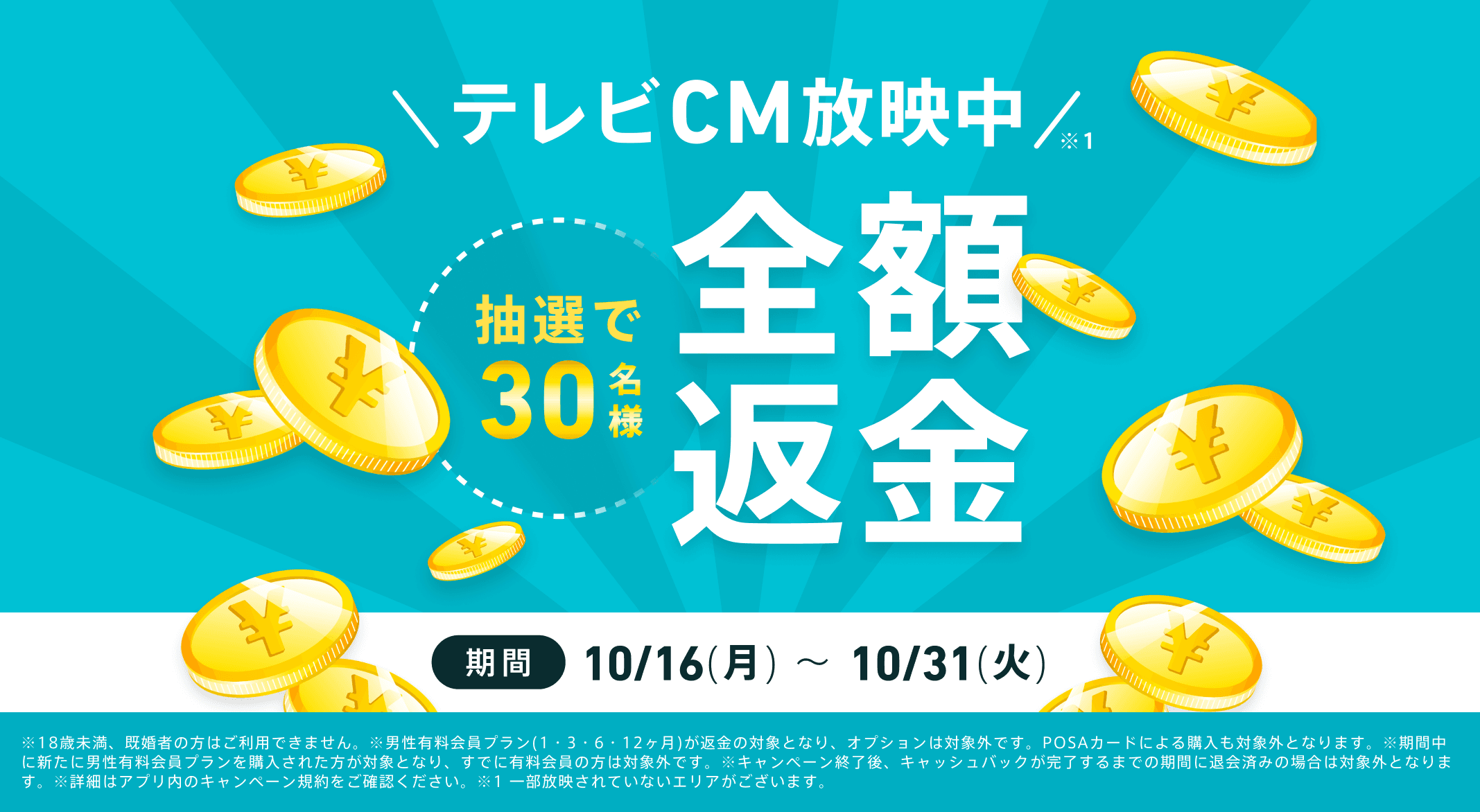 ・期間中に男性有料会員プランを購入した方の中から抽選で30名様に初回支払い分の料金を全額キャッシュバックします。