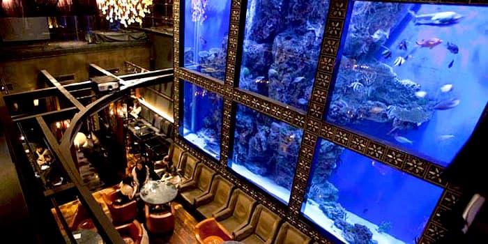 この店の魅力はなんといっても、吹き抜けの幅6メートル×高5メートルの巨大アクアリウム。ウミガメやサメ、熱帯魚達が優雅に泳ぎ回っています。