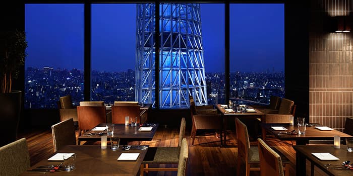 窓の外には東京のきらめく夜景がひろがります。またすぐ目の前には東京スカイツリーがそびえたっています。