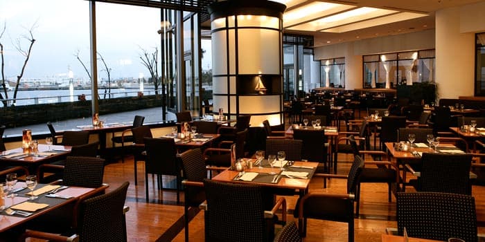 横浜港が目の前に広がるベイサイドレストラン。店内は明るく開放感があります。
