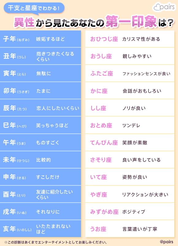 あなたの”干支”と”星座”から、「異性から見たあなたの第一印象」を診断する画像が面白いと評判です。