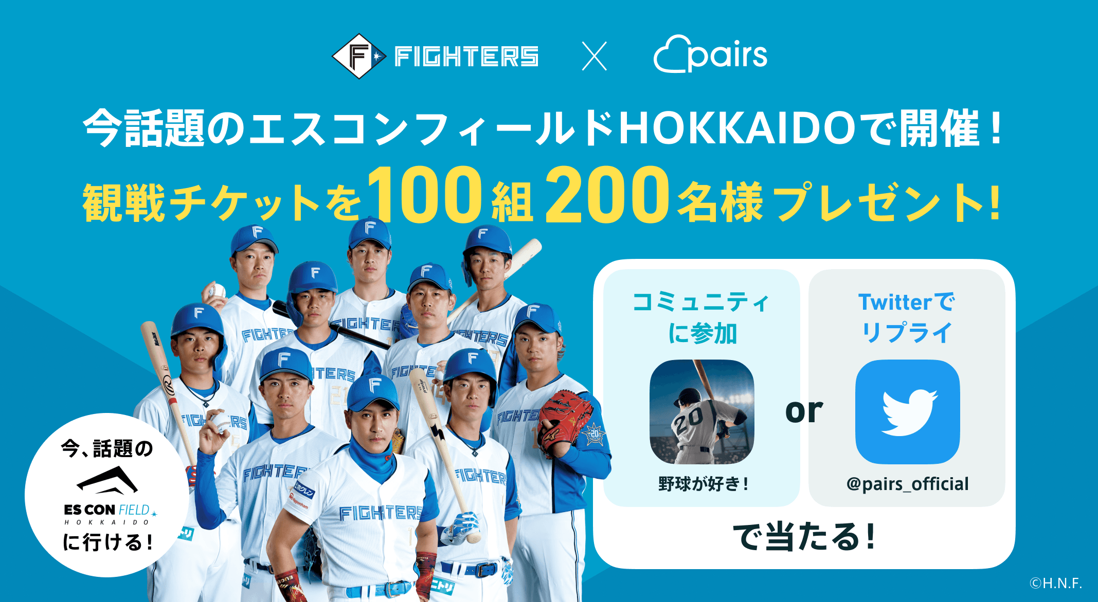 2023年5月8日(月)より、北海道日本ハムファイターズとペアーズがコラボし、「大人のファイターズナイト」観戦ペアチケットを合計100組200名様にプレゼントするキャンペーンを開催!