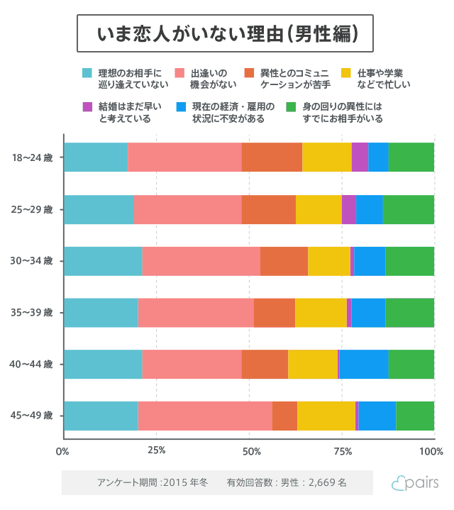 どの年齢層の男性も、「出逢いの少なさ」と「理想のお相手に出逢えない」ことが、恋人がいない大きな理由だと考えていることがわかりました。