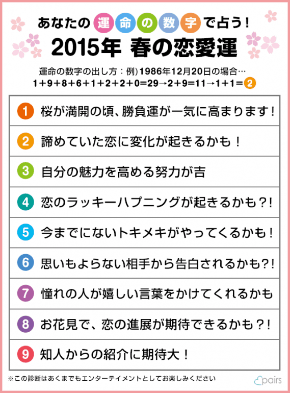 生年月日の数字をすべて足して 1ケタにするだけで、あなたの「 2015年 春の恋愛運」がわかります!