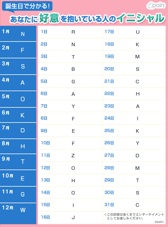 あなたの生年月日から、あなたに「好意を抱いている人のイニシャル」を診断する画像が面白いと評判です。