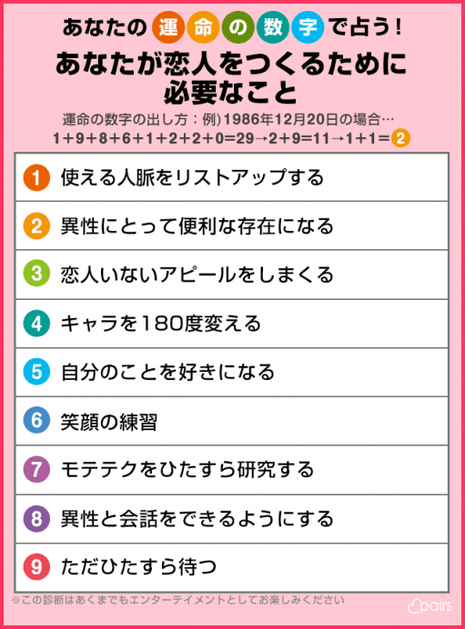生年月日の数字をすべて足して1ケタにするだけで、あなたが「恋人をつくるために必要なこと」がわかります!