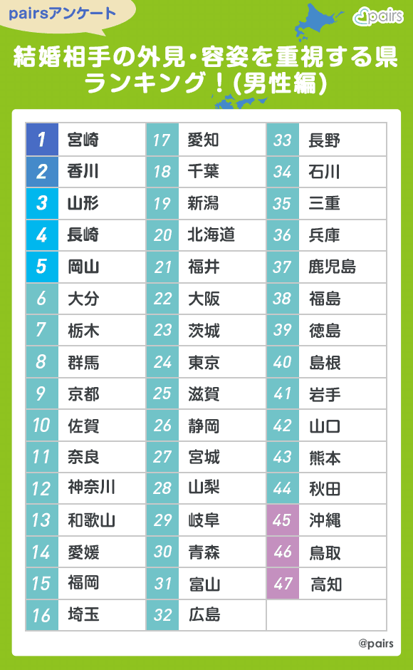 1位は太陽の恵みあふれる宮崎県という結果に。と言え、全体の2割程度。結婚相手の容姿・外見を重視するという意見は意外の少ないこと