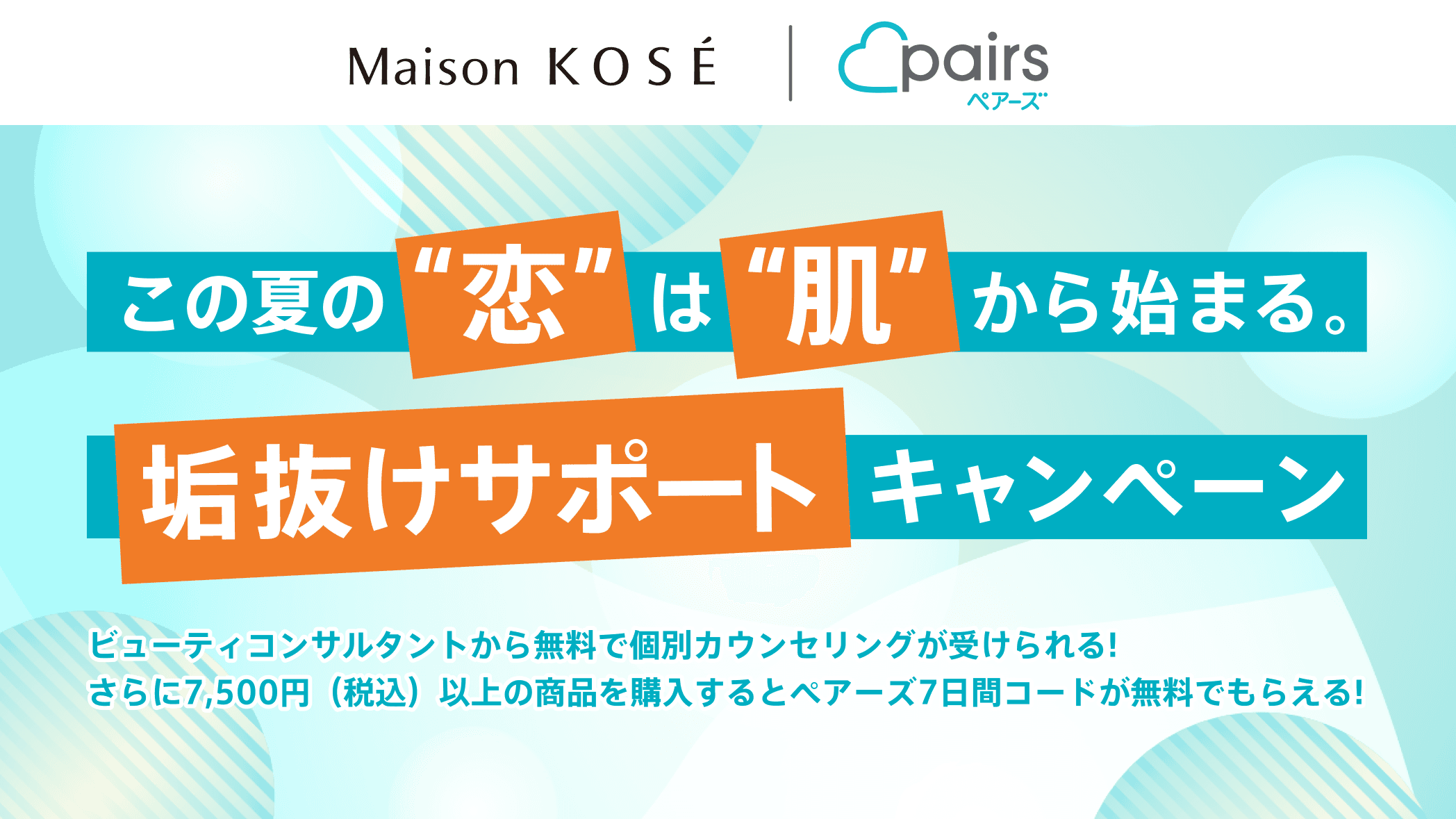 ペアーズでは昨年に引き続き、ペアーズとMaison KOSÉのコラボイベントとして「この夏の“恋”は“肌”から始まる。ペアーズ×Maison KOSÉ 垢抜けサポートキャンペーン」を実施いたします。