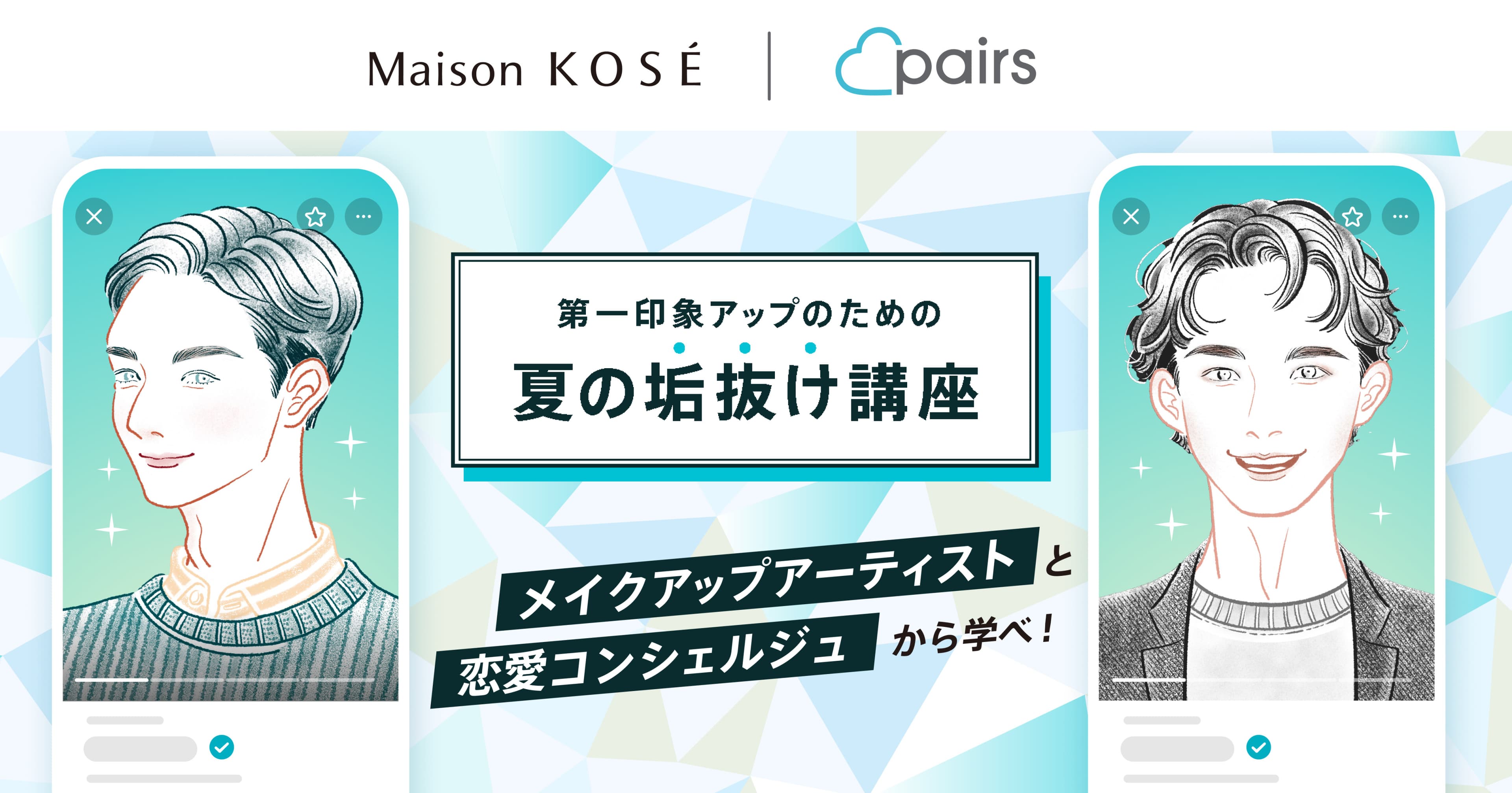 Maison KOSÉとの初のコラボレーションとして、双方の強みを活かしたイベントを通じて、ペアーズの男性ユーザーを対象にスキンケアやメイクのレッスンを通じて肌や表情を垢抜けさせることで、マッチングからデートを成功に導くまでの印象アップに繋がる情報をお届けします。