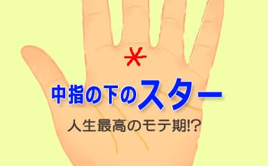 3本の線が一箇所で交わる「スター」が中指の下に現れたら、恋愛や結婚が叶う暗示。良縁あり!