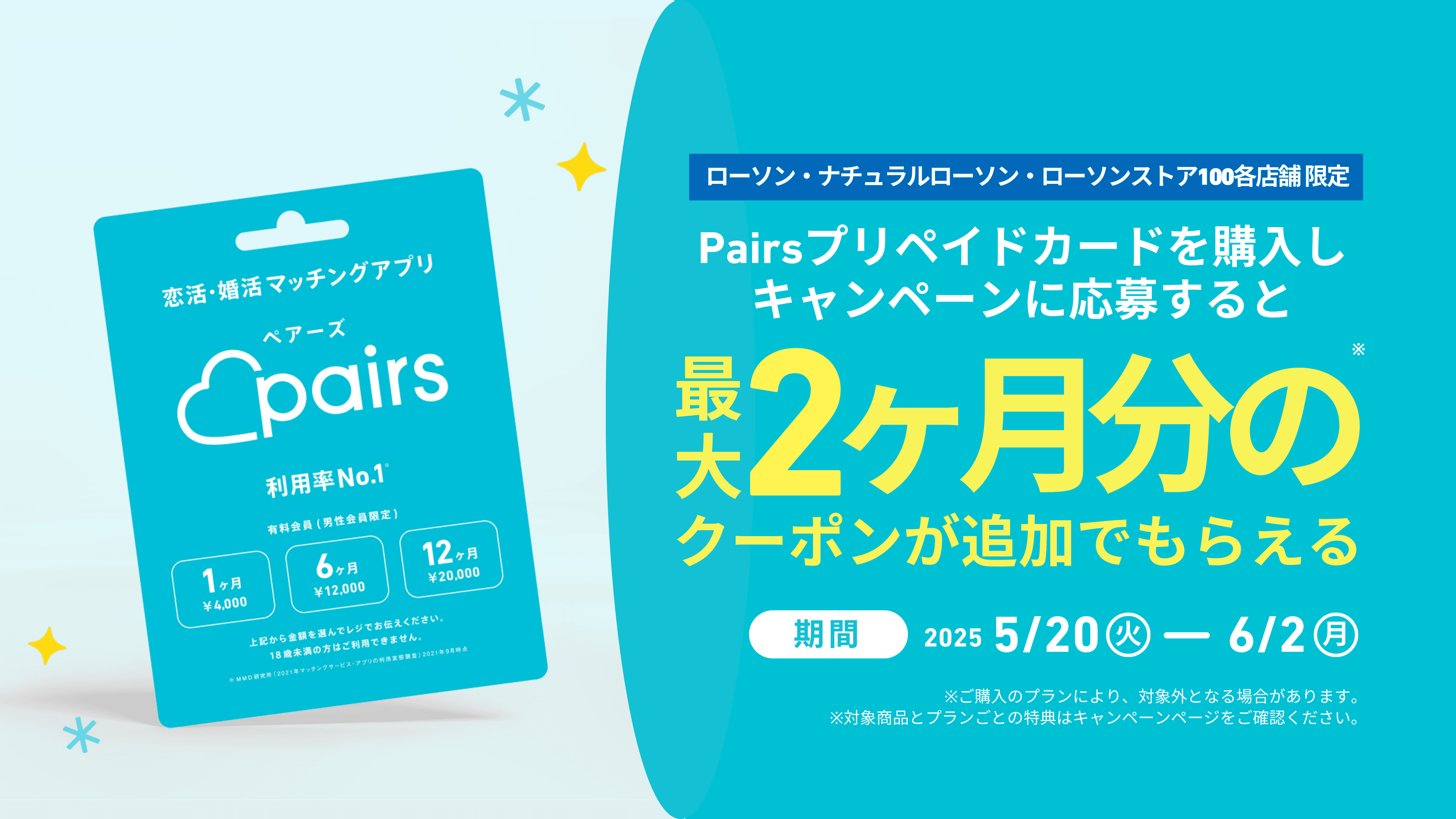 2025年5月20日(火)〜6月2日(月)までの期間中にローソン・ナチュラルローソン・ローソンストア100各店舗にてペアーズプリペイドカード6ヶ月分またはペアーズプリペイドカード12ヶ月分をご購入後、特設サイトからご応募いただくと、もれなく次回使えるクーポンをプレゼントするキャンペーンを開催いたします。