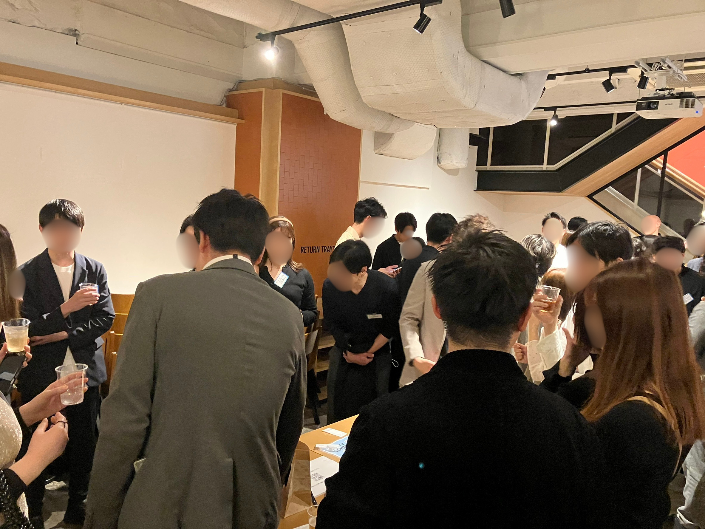 イベントはスタンディング形式で行われ、会場内では軽食とアルコールを含むドリンクが提供されており、開始直後から、参加者が自然な形で会話を始めやすい工夫が見られました。