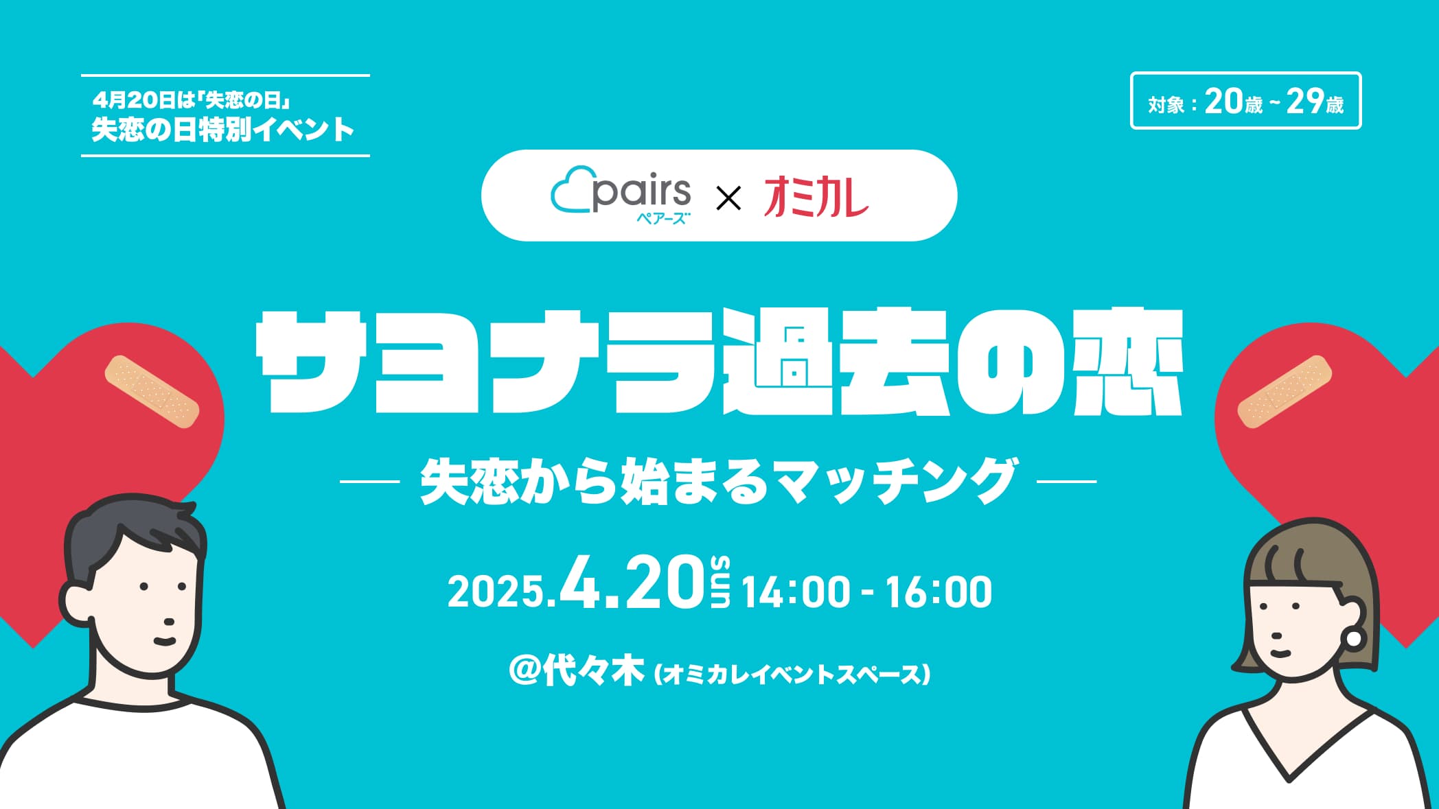 2025年4月20日(日)にペアーズは、会員数91万人超の、「今月行ける婚活パーティー・街コン」掲載数日本No.1(※1)を誇る日本最大級の婚活情報サイト「オミカレ」とコラボレーションして、4月20日「失恋の日」にちなんだ、リアルでのマッチングイベント「サヨナラ過去の恋~失恋から始まるマッチング~」を開催します。