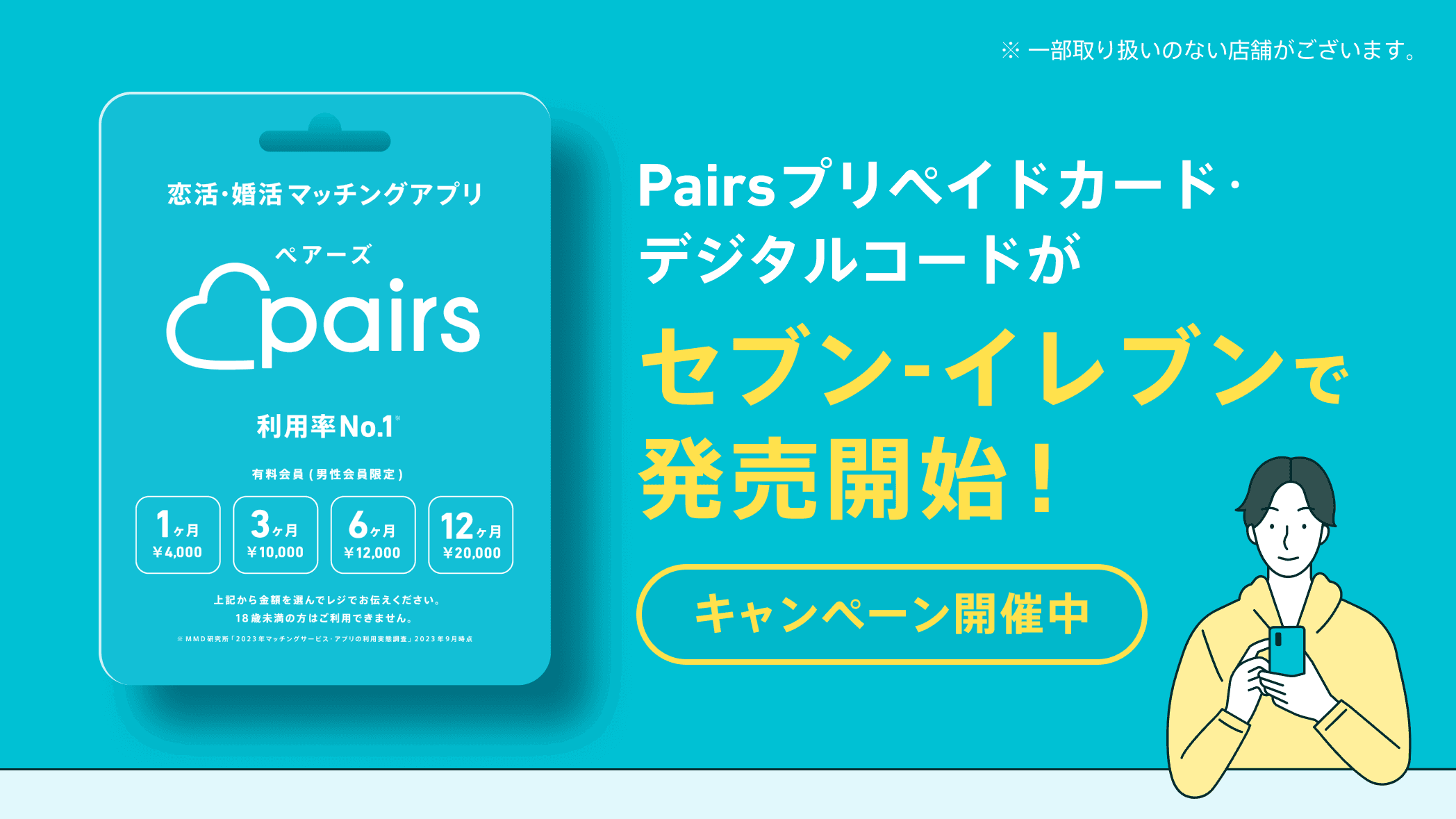 今回の発売開始を記念して、2024年3月25日(月)から2024年4月7日(日)の期間中に、セブン-イレブンで Pairsプリペイドカード、スマホプリペイド版Pairsプリペイドコードを購入のうえ、専用サイトより応募すると、抽選で300名様にセブン-イレブン専用QUOカードPay1,000円分(※2)をプレゼントする「【セブン-イレブン限定】Pairsプリペイド購入キャンペーン」を実施します。