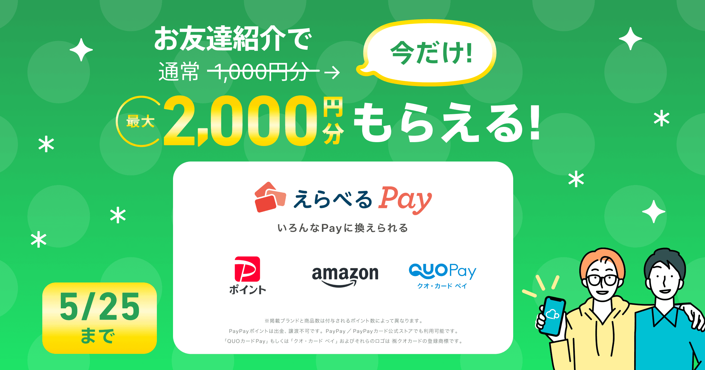 ペアーズを使ったことがないお友達を紹介すると、いろんなPayに換えられるえらべるPayがもらえます!
