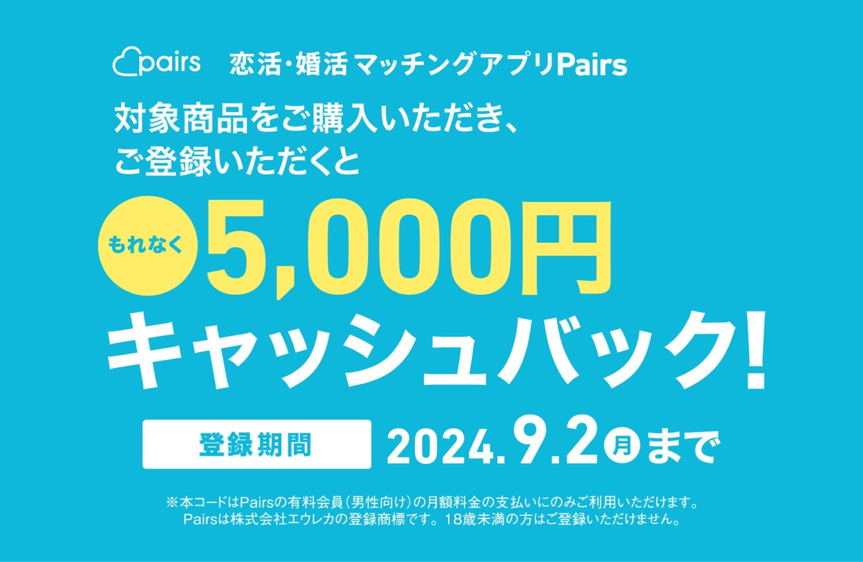 2024年8月19日(月)から、キャンペーン期間内に対象店舗でPairsプリペイドカード・デジタルコード 3ヶ月プラン(10,000円)を購入・キャンペーンサイトに登録すると、もれなく5,000円のキャッシュバック!