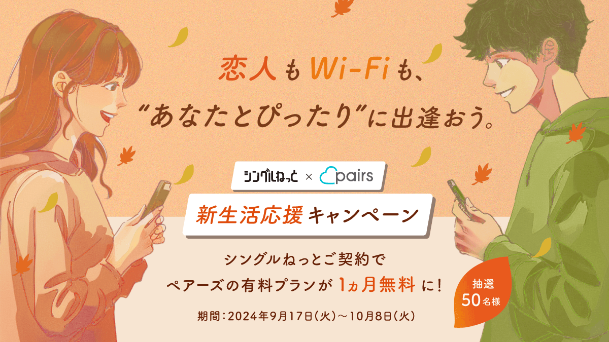 2024年4月25日(木)から5月16日(木)の期間に、ちょうどいい速度で、シンプルに安い、ひとり暮らし応援Wi-Fiのシングルねっとを契約すると抽選で50名様にペアーズの有料プランが1ヶ月無料になるコードが当たります。