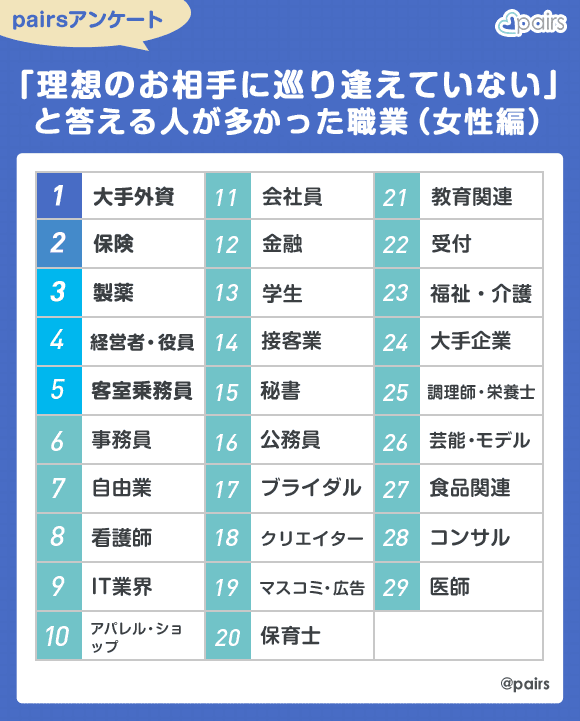 女性のPairs会員様に恋人がいない理由を伺ったところ、「理想のお相手に巡り逢えていない」という女性が多いという事実が明らかに! 今回は、「理想のお相手に巡り逢えていない」と答える女性が多かった職業トップ 5をご紹介!