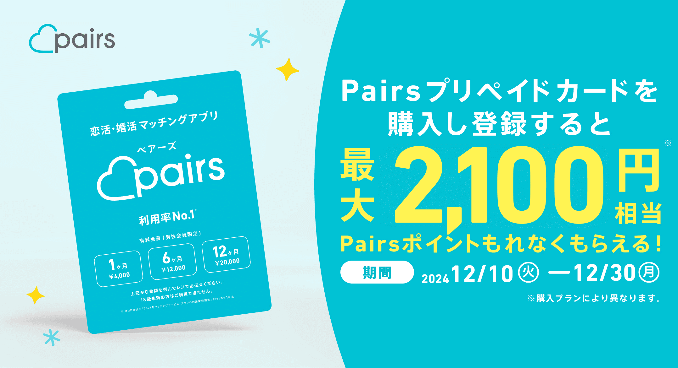 キャンペーン期間内に対象店舗でPairsプリペイドカード・デジタルコードを購入すると、購入プランにより最大約2,100円相当のPairsポイントをもれなくプレゼント!ぜひ、お得なこの機会にご購入ください。