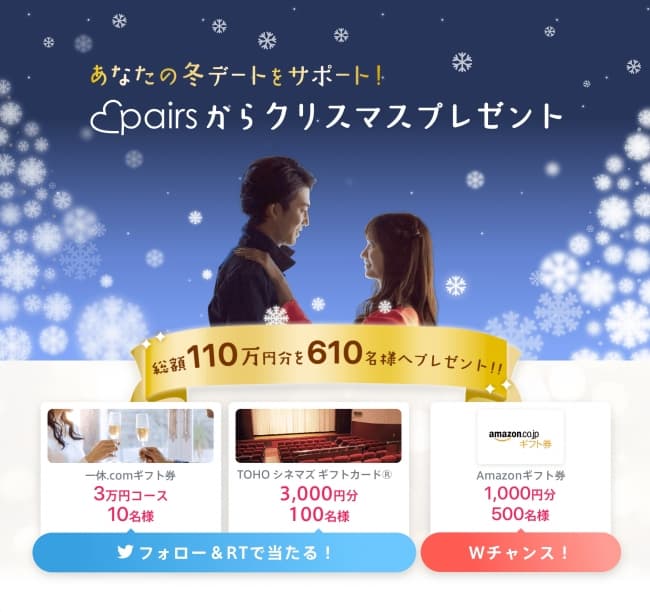 本キャンペーンでは、Pairsの公式Twitterアカウントをフォロー&リツートすることで、冬のデートで使えるプレゼントが抽選で当たるほか、Wチャンスとして、デート前の自分磨きに使えるギフトをご用意。総額110万円分を610名様にプレゼントします。