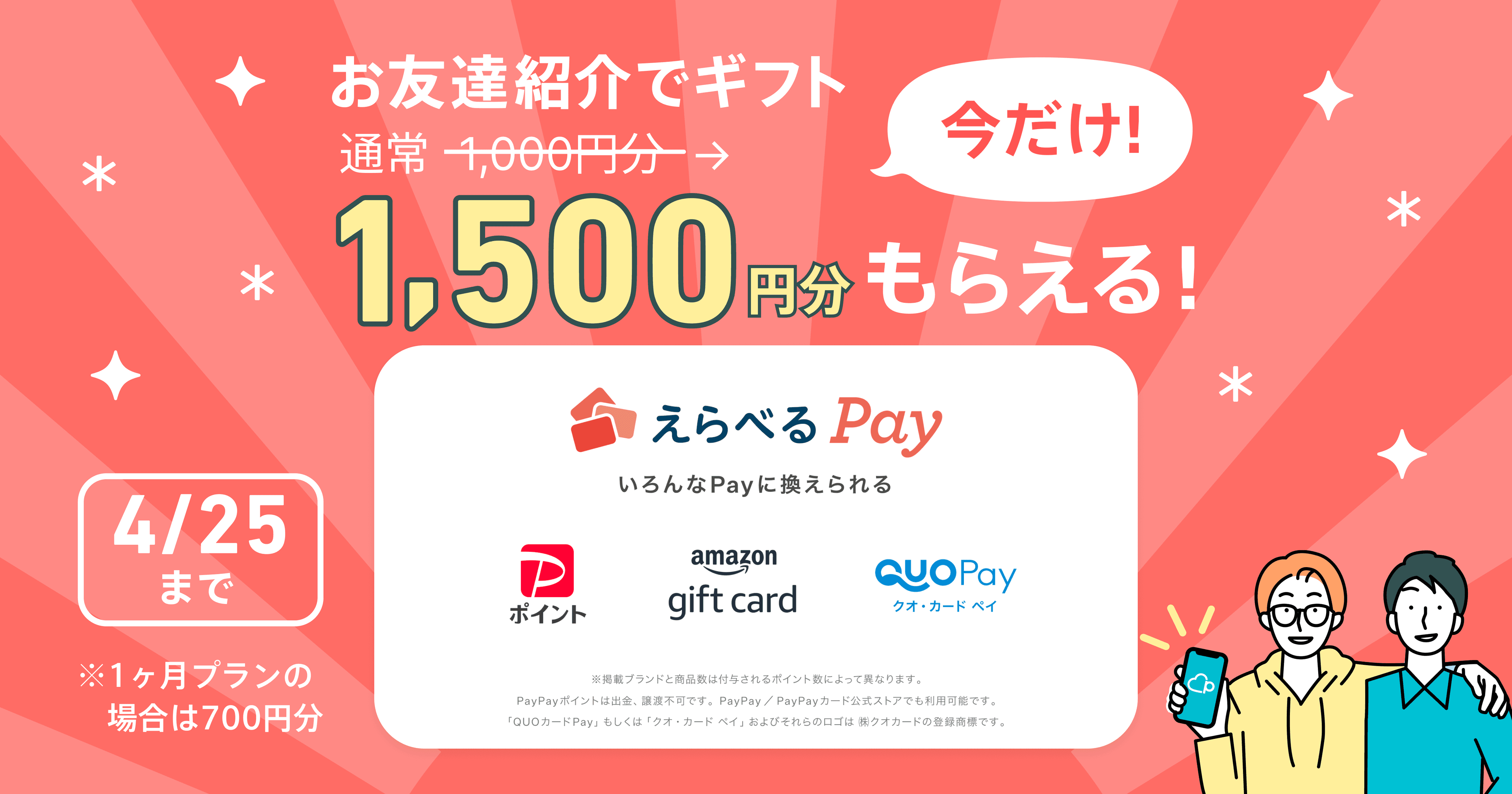 あなたから招待されたお友達が初めて男性有料会員プラン(1・3・6・12ヶ月プランのいずれか)に登録して、あなたの招待コードを入力すると、あなたには最大1,000円分、お友達には最大2,000円分のえらべるPayが付与されます。