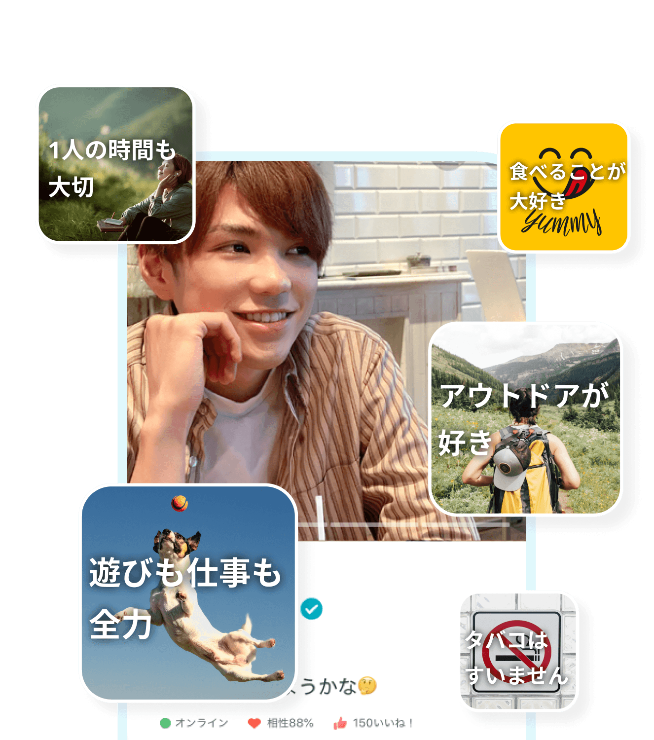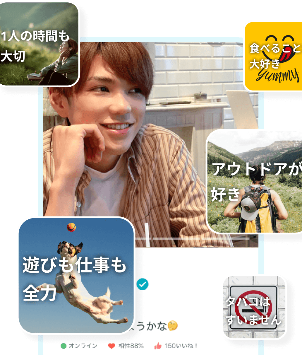 自分の価値観やライフスタイルにあったタグを選ぶだけで、簡単にあなたの好きなことを表現できます。お相手との共通点もわかるので、会話のきっかけにも。