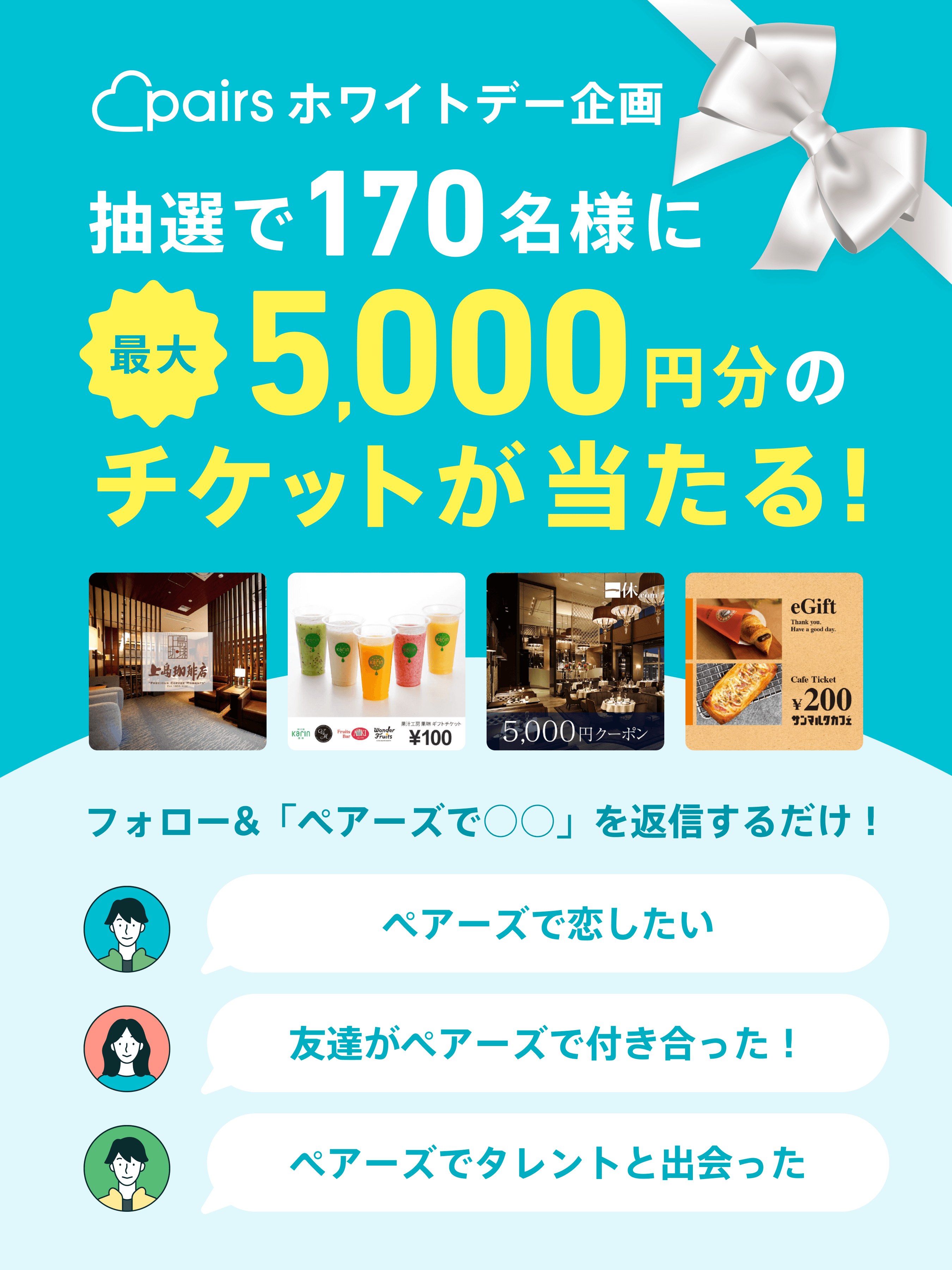 ペアーズをフォローして返信すると、最大5,000円分の飲食チケットが当たります!